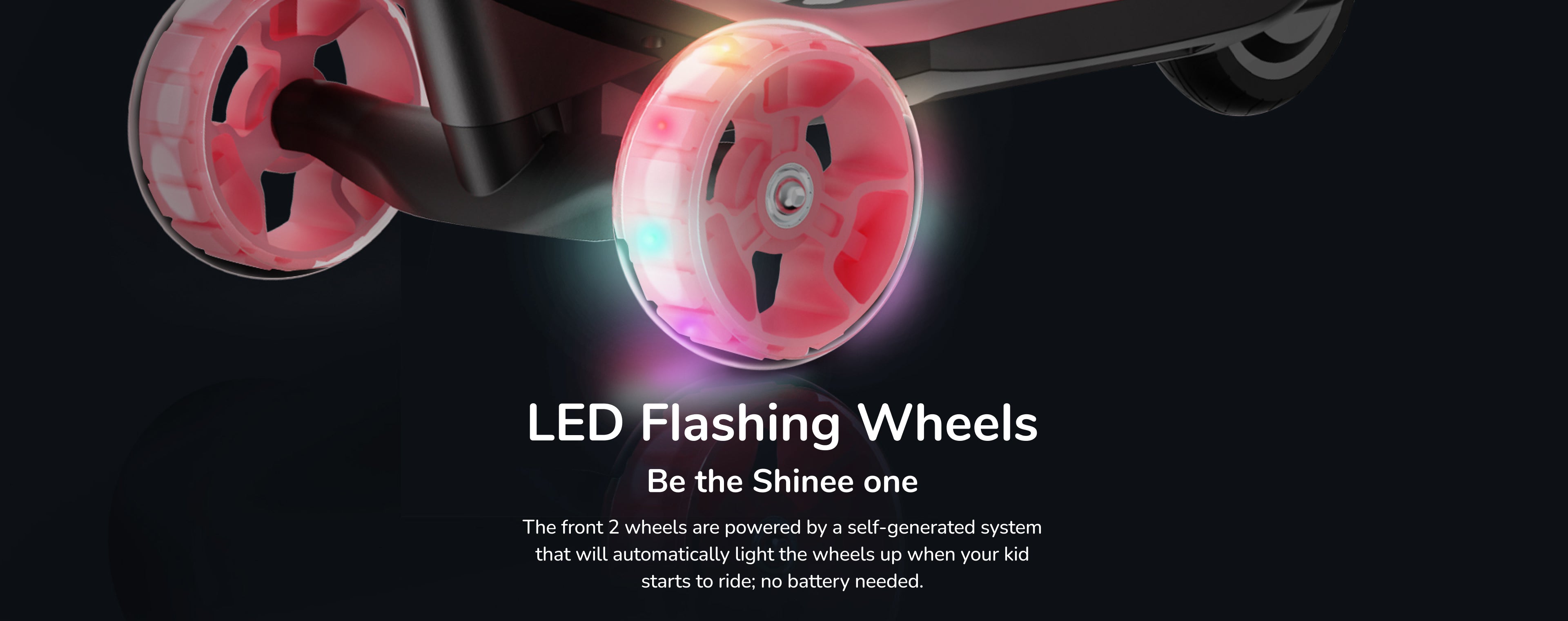 A: When the switch is turned on, the deck will turn on the lights flashing. The front 2 wheels are designed as a self-generated power system. They will automatically light up when kids start to ride. They shine bright and stand out for extra fun and safety.