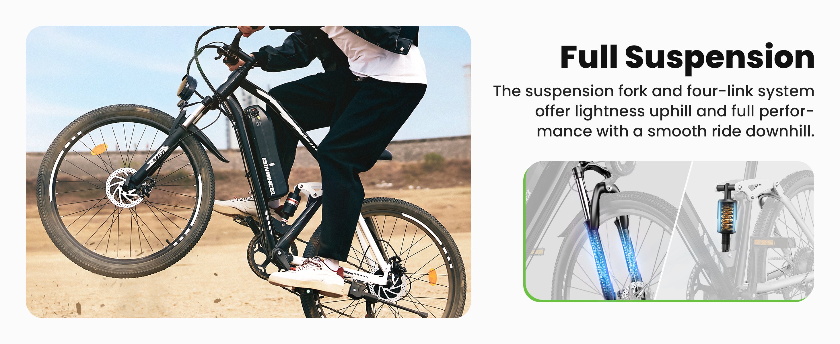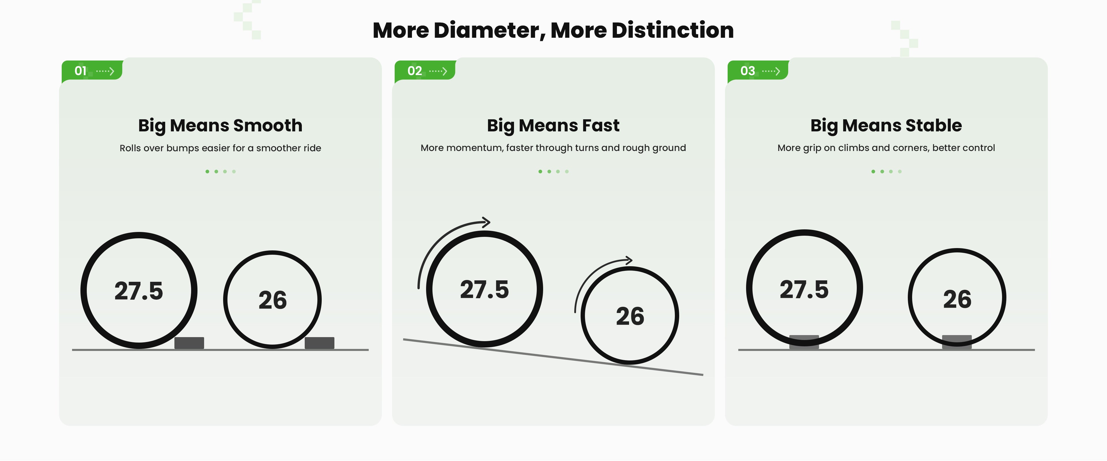 The M50 is designed for high-traction tires built for rugged trails, rocky paths, and unpredictable terrain, equipped with 27.5*2.3“ tires and a durable frame for enhanced stability and traction.