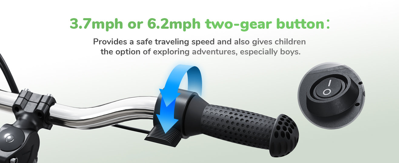 A:The SK12 has two top speeds that can be set (3.7/6.2MPH) to perfectly suit your child's different needs; The Maximum speed is 6.2 MPH. Warm Tips: The speed setting button is located on the bottom of the bike