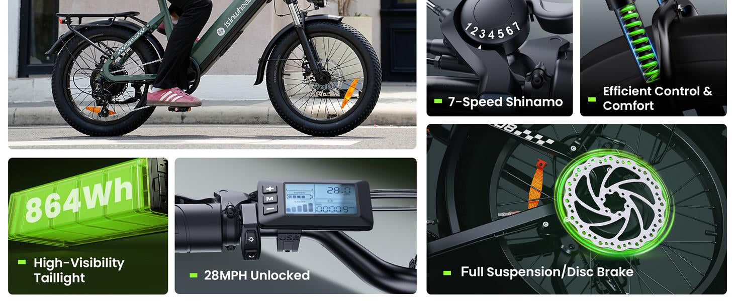 The isinwheel U8 combines city comfort with off-road capability. With wider 20”×3” tires, it delivers extra stability and grip on all kinds of roads. The 1000W motor provides strong acceleration and supports speeds up to 28 MPH, while the Step-Thru frame makes it easy to hop on and off — especially for riders of different heights or for women.