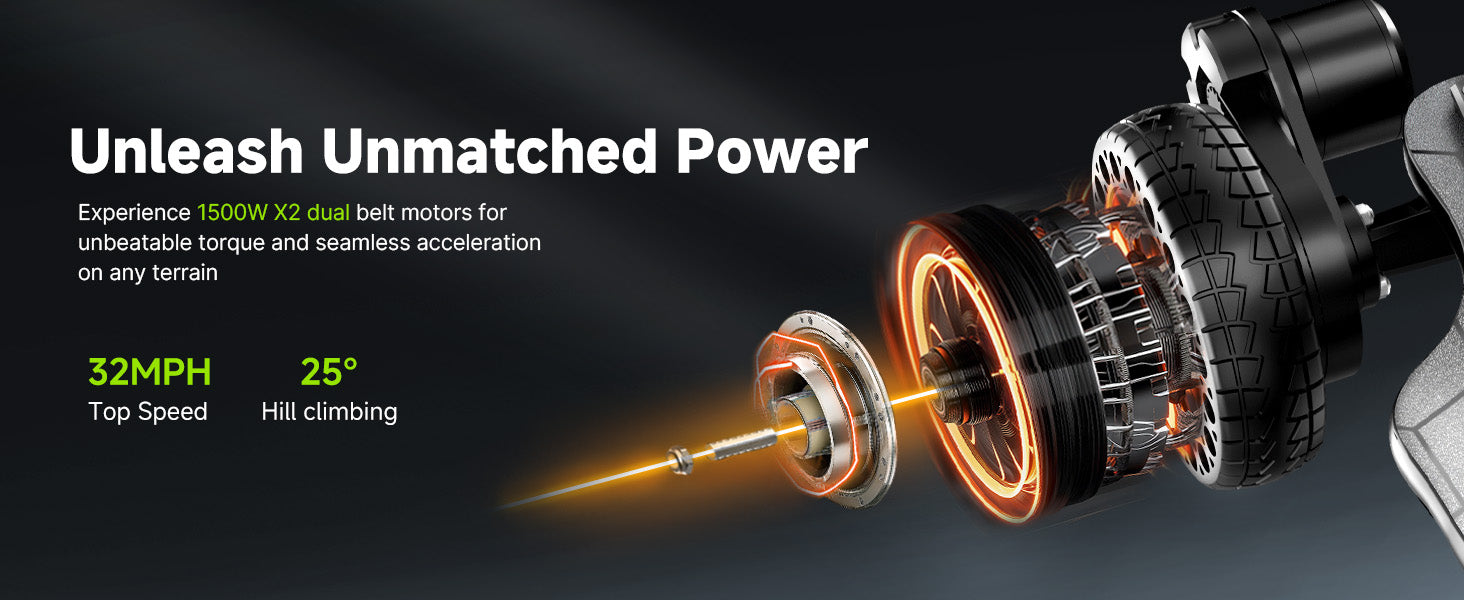 ✅1500W*2 Belt Motors, Max Speed 32 MPH. 25° Hill Climbing